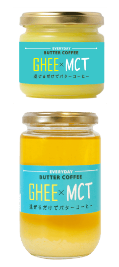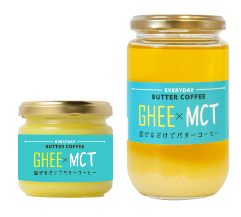 [ギー]と[MCTオイル]を50:50でブレンドしたオイルです。スプーン1杯のGHEE×MCTオイルをコーヒーに混ぜるだけで、簡単バターコーヒー!